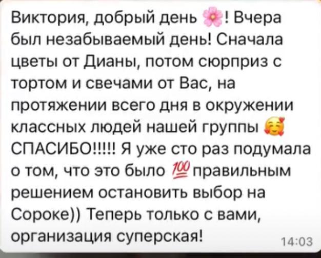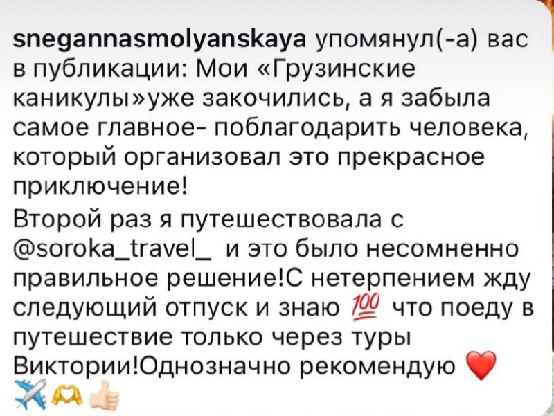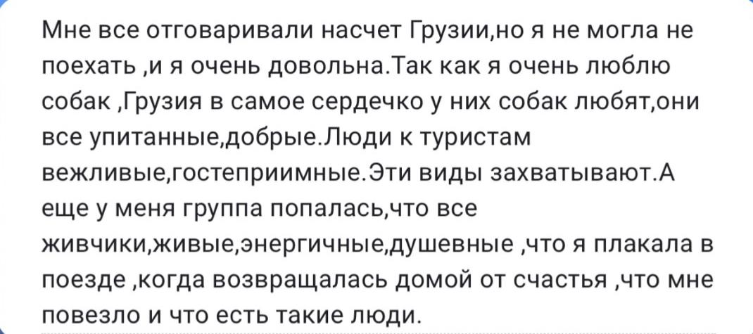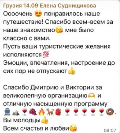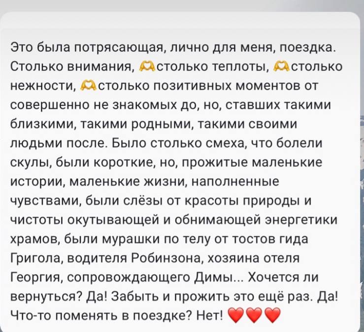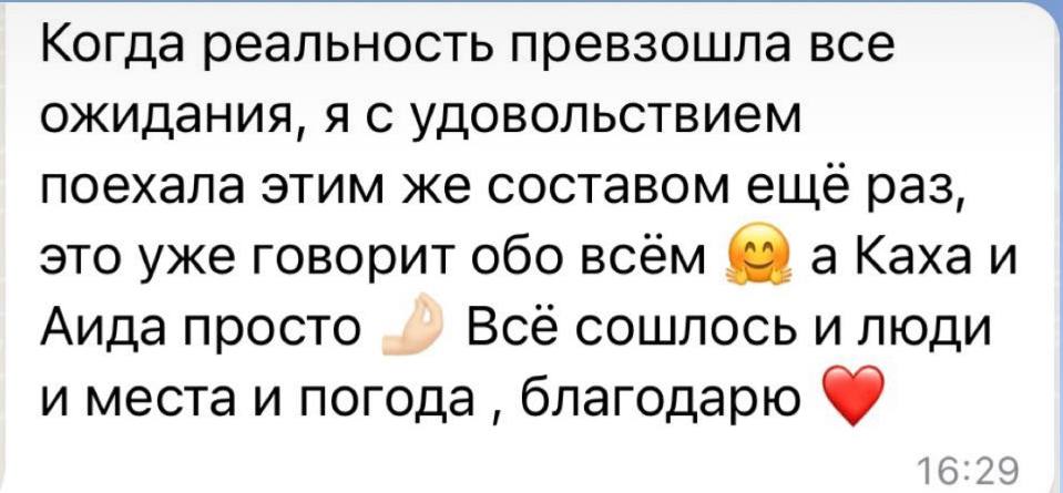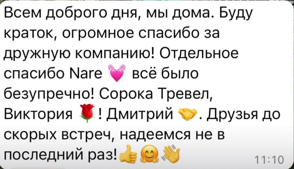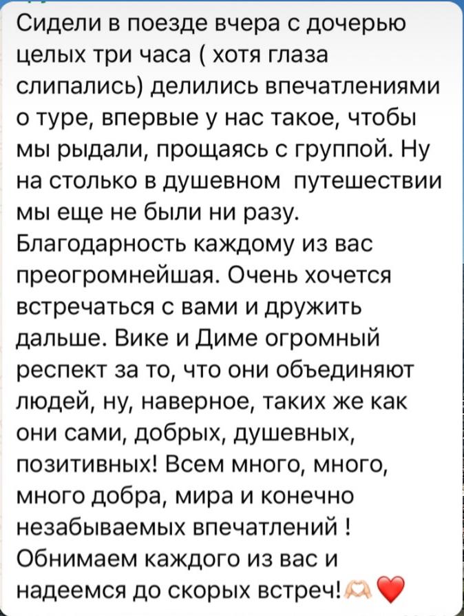 «Первый раз поехала в путешествие одна. Очень переживала, что буду чувствовать себя некомфортно среди незнакомых людей. Но, как оказалось, совершенно зря! Компания собралась очень классная: все дружелюбные, интересные, успешные, веселые и увлеченные путешествиями. Очень здорово, когда есть с кем поделиться впечатлениями, обсудить и посмеяться. До сих пор мы общаемся и даже планируем новую поездку вместе. Большая заслуга в этом организатора, который с первой минуты создал атмосферу дружеской компании.»